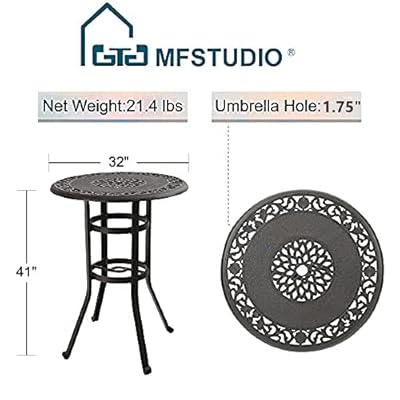 Square metal outdoor patio bistro dining table with center umbrella hole and cast iron stylish design.